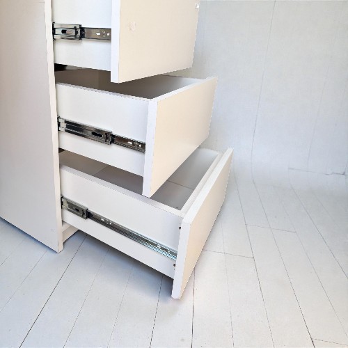 Herrajes de Primera: Cajonera lateral de 3 espacios con correderas telescópicas metálicas. Soportan más peso, no se traban y permiten extraer el cajón al 100%.