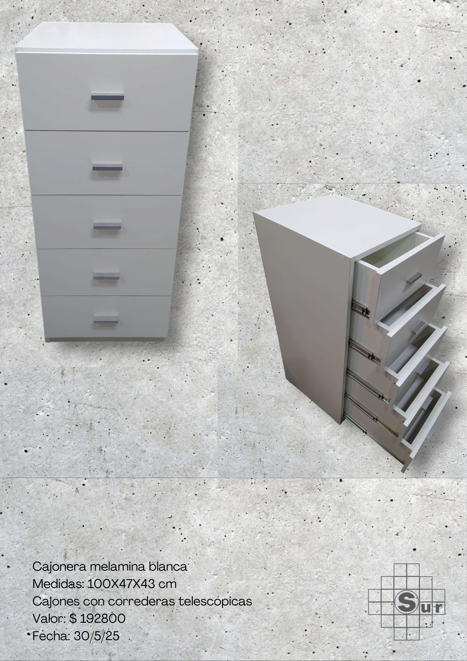Esta cajonera de melamina blanca cuenta con cinco cajones espaciosos, equipados con correderas telescópicas que aseguran una apertura suave, completa y duradera, ideal para el uso diario. Su formato vertical optimiza el espacio y es perfecta tanto para oficinas como para dormitorios, talleres o estudios.