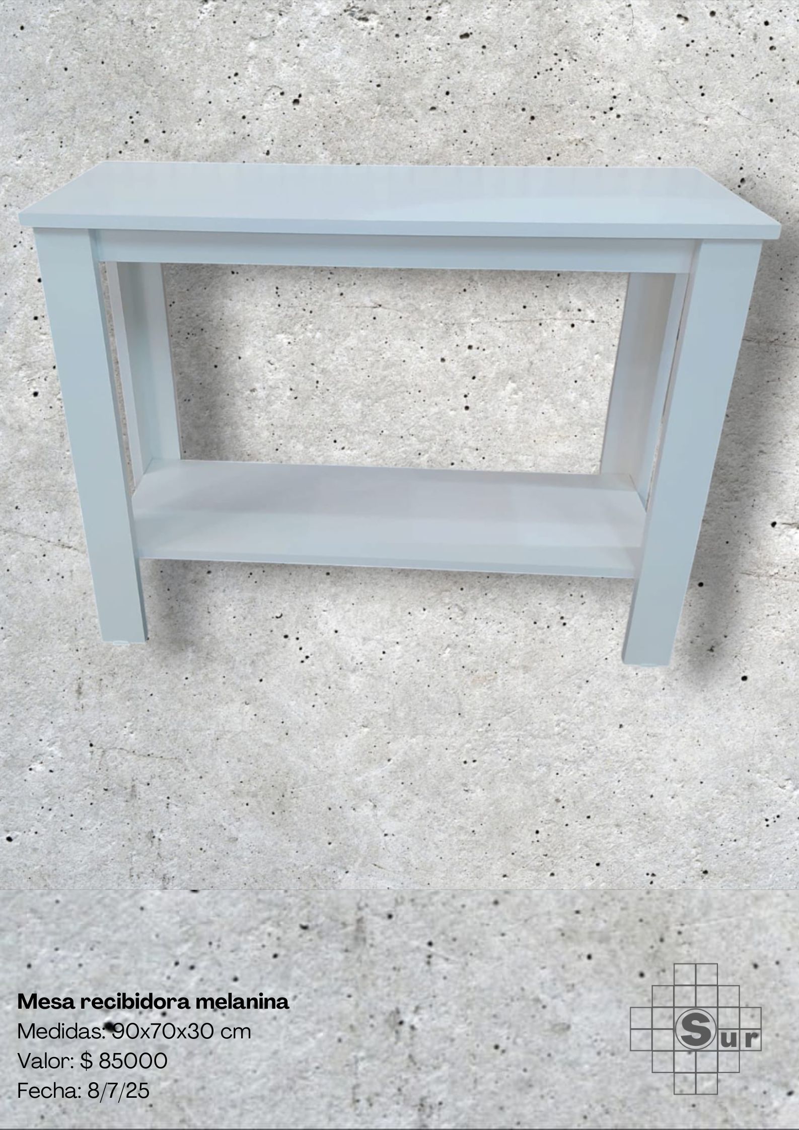 Mesa recibidora de melamina, simple y funcional, ideal para sumar un apoyo extra en entradas, pasillos o rincones del hogar. Su estante inferior brinda espacio adicional para organizar objetos o decorar. Su diseño limpio y liviano combina con distintos estilos de interiores.