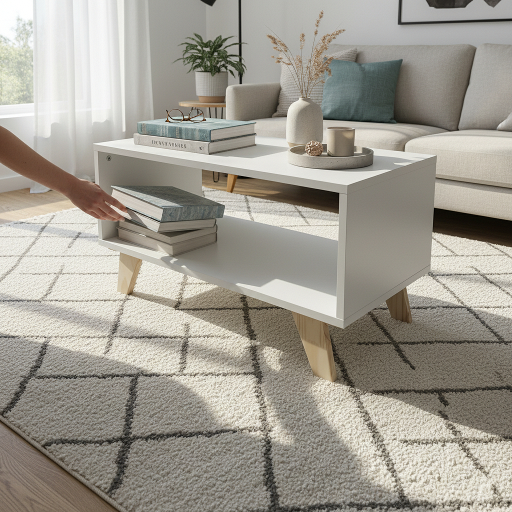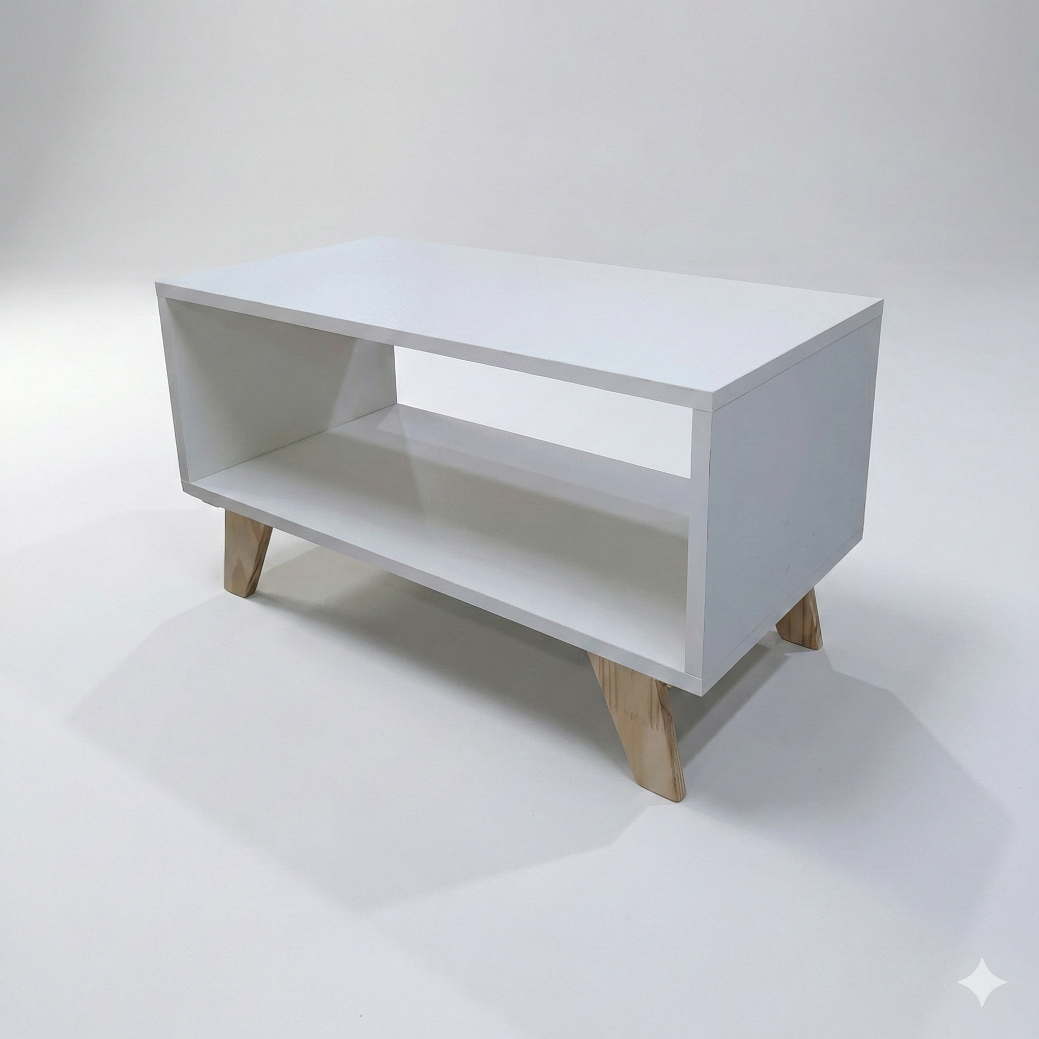 Esta mesa ratona con diseño de cubo combina simplicidad y carácter. Fabricada en melamina blanca y pino natural, su forma alargada y líneas rectas la convierten en una pieza perfecta para espacios modernos, minimalistas o multifuncionales. Puede utilizarse como mesa central, lateral.